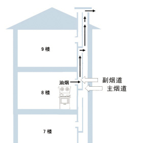 每戶的煙道開(kāi)口,也就是逆止閥的位置,應(yīng)該比主煙道上的低,因?yàn)闊煔舛际峭狭鲃?dòng)的,所以主煙道的氣味很少會(huì)進(jìn)入支煙道里面,也就不會(huì)出現(xiàn)串味的現(xiàn)象了。